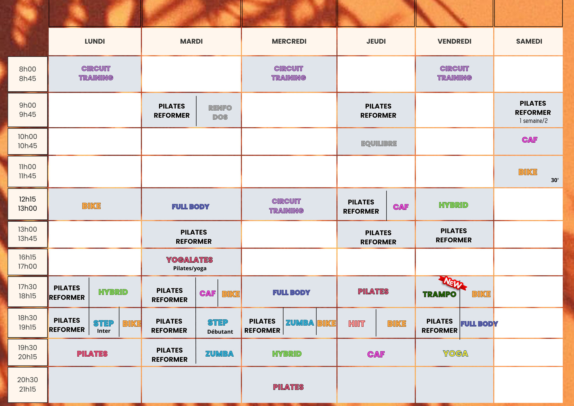 Retrouvez ici tous nos créneaux pour prendre soin de vous à votre rythme.